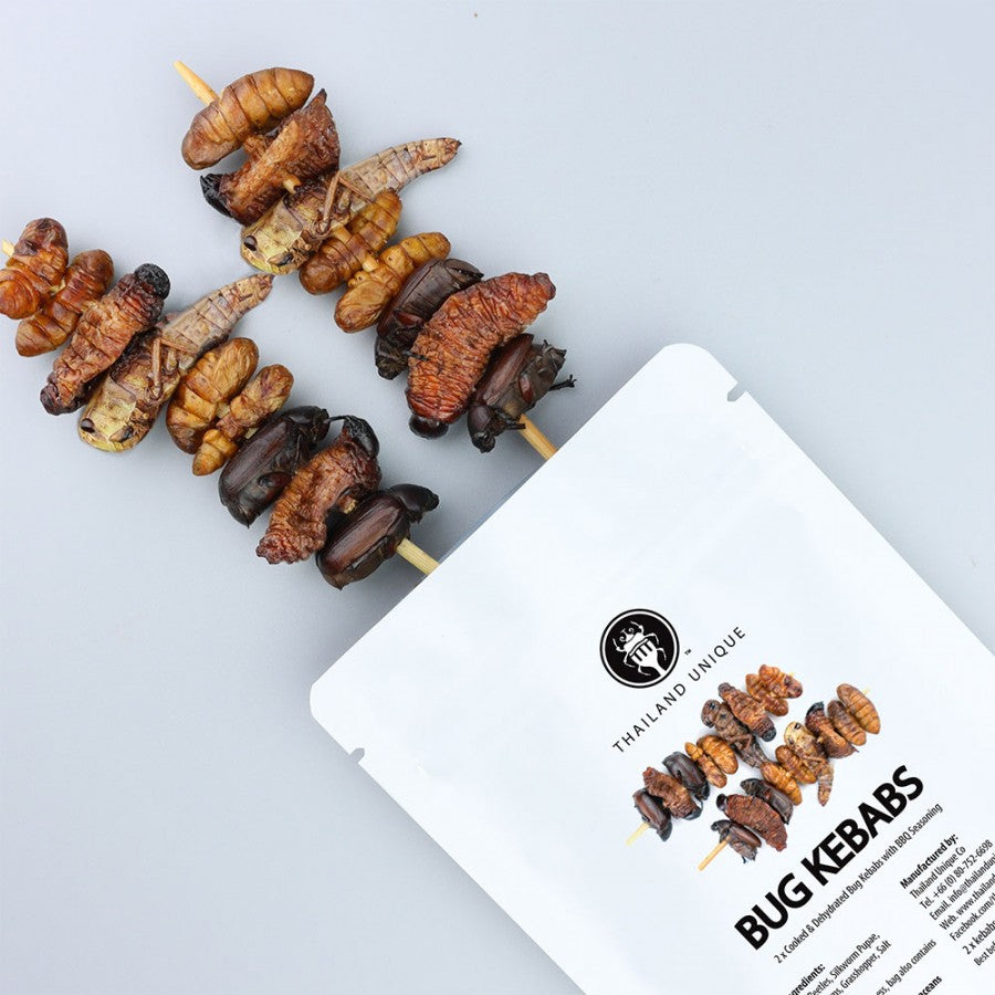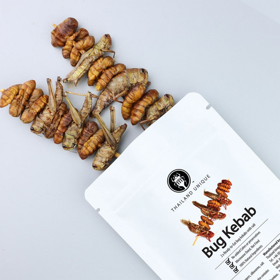 Spiedini di insetti con una selezione di quattro insetti e pupe di insetti. Tra cui coleotteri di giugno, bachi da seta, vermi del sago e cavallette, infilzati su uno spiedino, in stile kebab. Cotti, disidratati e conditi con polvere per barbecue. Due spiedini per confezione.