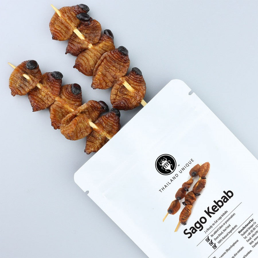 Utilizziamo solo vermi di sago della massima qualità, provenienti direttamente dalla nostra fattoria nel sud della Thailandia. Durante l'intero ciclo di vita, i vermi di sago vengono nutriti con una dieta a base di tronchi di palma schiacciati, biologici e non OGM. Dopo la raccolta, i vermi vengono marinati per 24 ore in una salsa barbecue affumicata e cotta a fuoco lento. Vengono poi arrostiti, girati frequentemente e irrorati con ulteriore salsa barbecue fino a quando non diventano dorati e croccanti, e la salsa si addensa. I vermi arrostiti vengono quindi tolti dal forno e disidratati per diverse ore per ottenere la consistenza perfetta. Una volta raggiunto il livello di umidità ideale, i vermi di sago vengono accuratamente infilzati su bastoncini di bambù e confezionati in sacchetti di alluminio con assorbitori di ossigeno per garantirne la freschezza duratura.